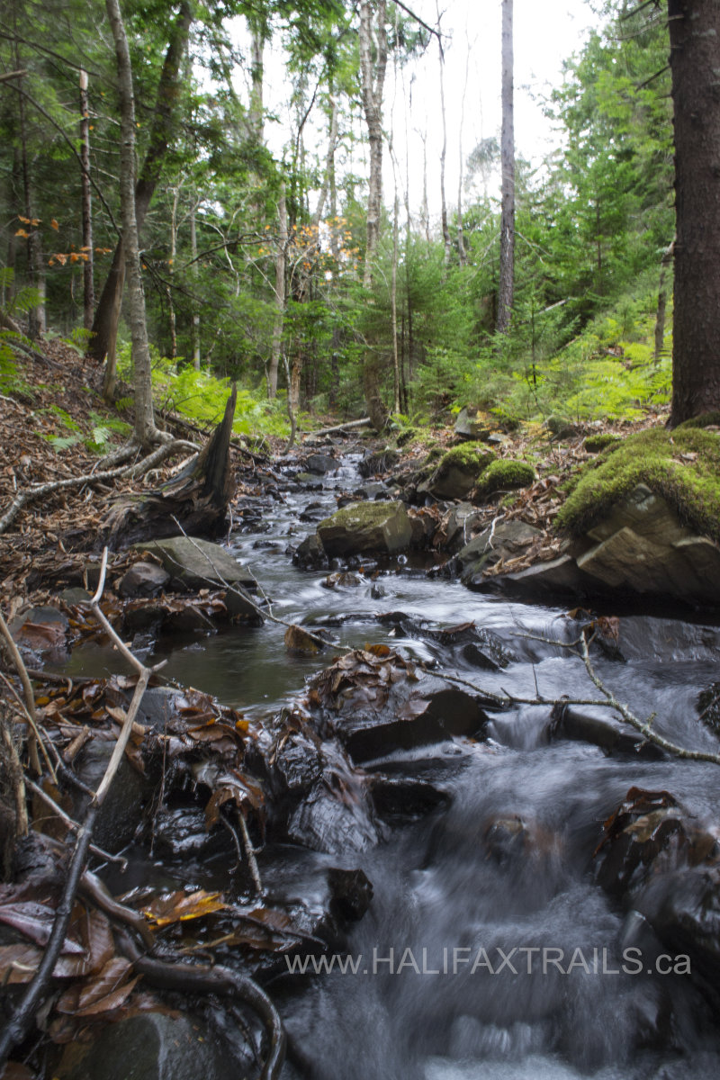 The trail winds its way through a mixture of tall stands of old-growth and patches of new-growth forest. Past hurricanes Juan and Dorian took a heavy toll on the park’s oldest trees, especially along this stretch of the park. The open patches of new growth you see along this trail are evidence of the damage done in recent years. Numerous benches along the way allow you to take a minute to enjoy the peaceful scenery.